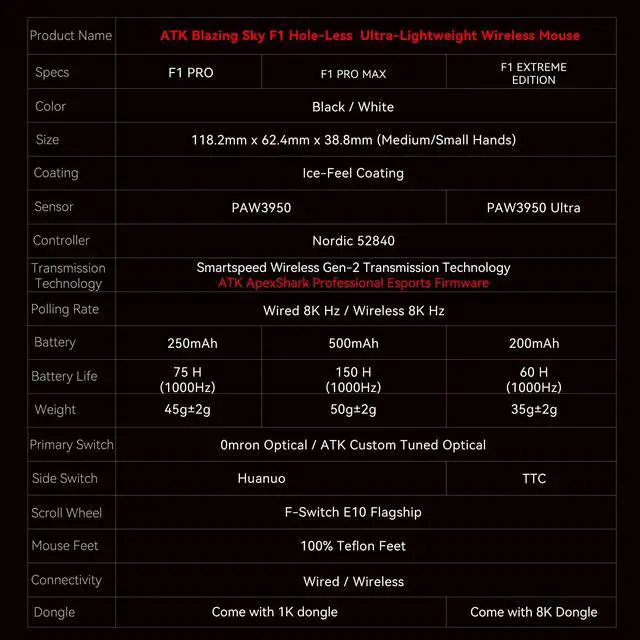 The ATK F1 Series is engineered for professional esports players who demand precision, speed, and control. Featuring a dual-mode connection (2.4 GHz wireless & USB-C wired), the F1 ensures smooth transitions between competitive matches and daily use. With an adjustable polling rate up to 8000 Hz, players experience near-zero input lag and ultra-responsive tracking.