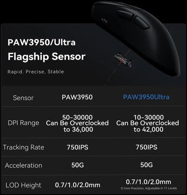 • FLAGSHIP SENSOR & MCU: Equipped with PixArt PAW3950 / 3950 Ultra and Nordic nRF52840 for ultra-precise tracking and stable wireless performance.