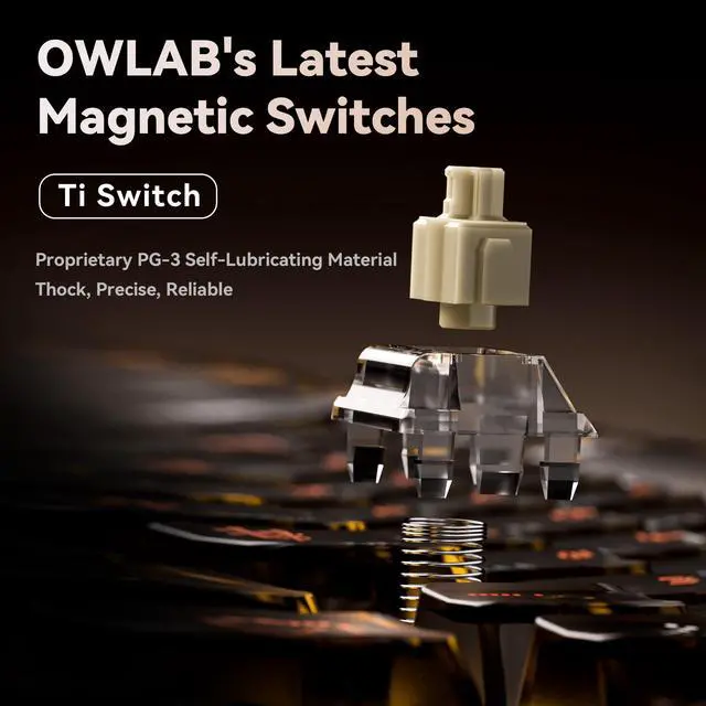 • HALL EFFECT MAGNETIC TI SWITCHES: Equipped with OwLab Ti magnetic linear switches featuring PG-3 lubrication; adjustable actuation (RT) from 0.005 mm step precision (0.1 mm to 4 mm). Ultra-smooth keystroke, zero bounce.