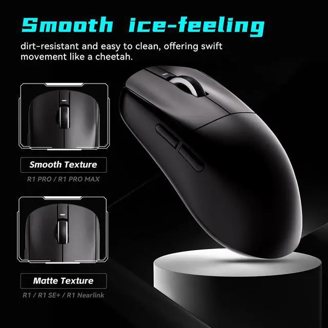 - R1 Pro: Highly responsive with 48 g ultra-lightweight shell, PAW3395 sensor, up to 4,000 Hz polling (with 4K dongle), ~75 hours battery, and Ice-feel coating.
