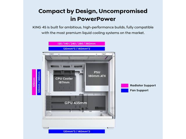 - The Montech King 45 is a full-sized ATX case designed for maximum airflow and versatile hardware compatibility. With a tempered glass side panel, multiple fan and radiator support, and ample interior space, it allows for high-performance builds with easy cable management. Ideal for gamers and PC enthusiasts who want both style and functionality in a robust chassis.