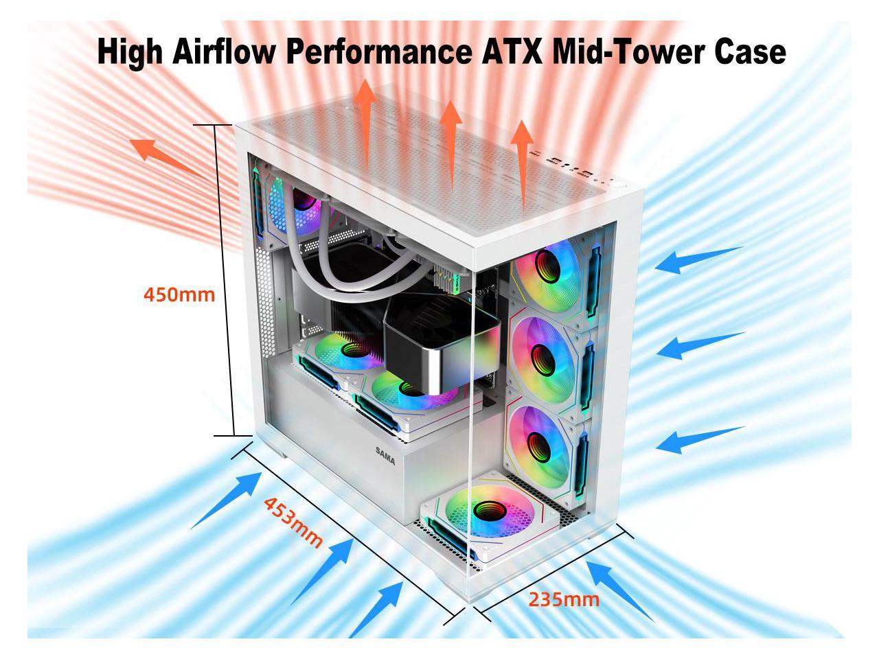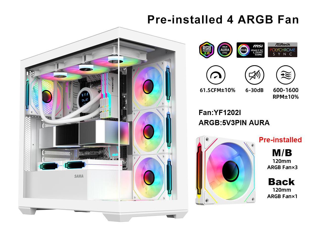 SAMA SV01 Gaming PC Case Computer Mid Tower ATX Case White with 4 Addressable RGB Fans Pre-Installed, Back Plug Motherboard Design, Tempered Glass Transparent Side Panel