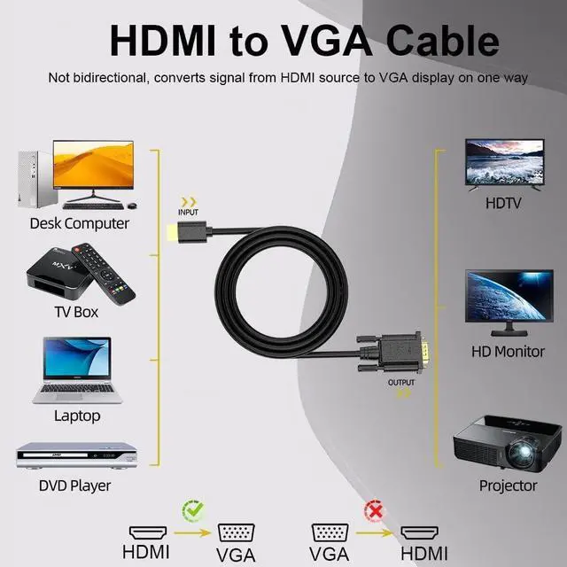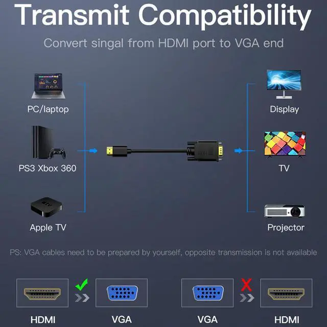 - Wide Compatibility: Built-in most advanced IC chip converts HDMI signal to VGA signal (Must Computer with HDMI and Monitor/TV/Projector With VGA), compatible with is compatible with computer, pc, desktop, laptop, ultrabook, notebook, Chromebook, Raspberry Pi, Intel Nuc, Roku, PS3, Xbox One, Xbox 360, Wii U, Set Top Box, TV BOX, or other devices with HDMI port