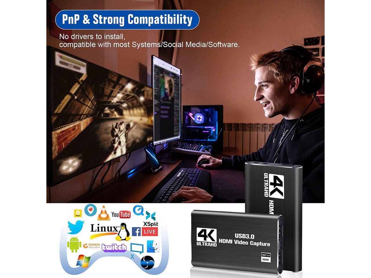 - Video Capture: Capture resolutions of capture card up to 1080p at 60fps for video source with hardware accelerated up-scaling/down-scaling.The recorded video resolution of capture card for switch depends on the original video, which is not changeable by capture. Automatically detect the input video format, and automatically adjust to the set output size and frame rate. The capture card for streaming suitable for high definition acquisition, live broadcasts, video recording, etc.
