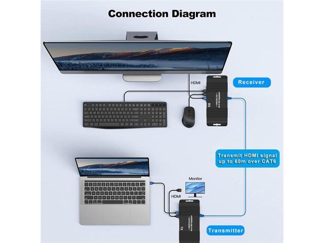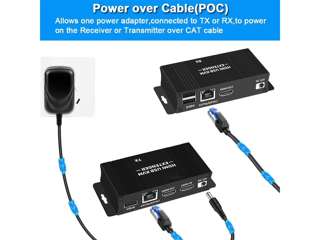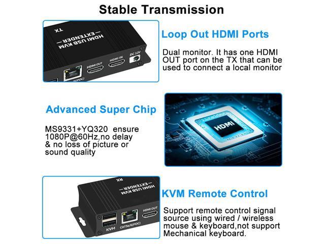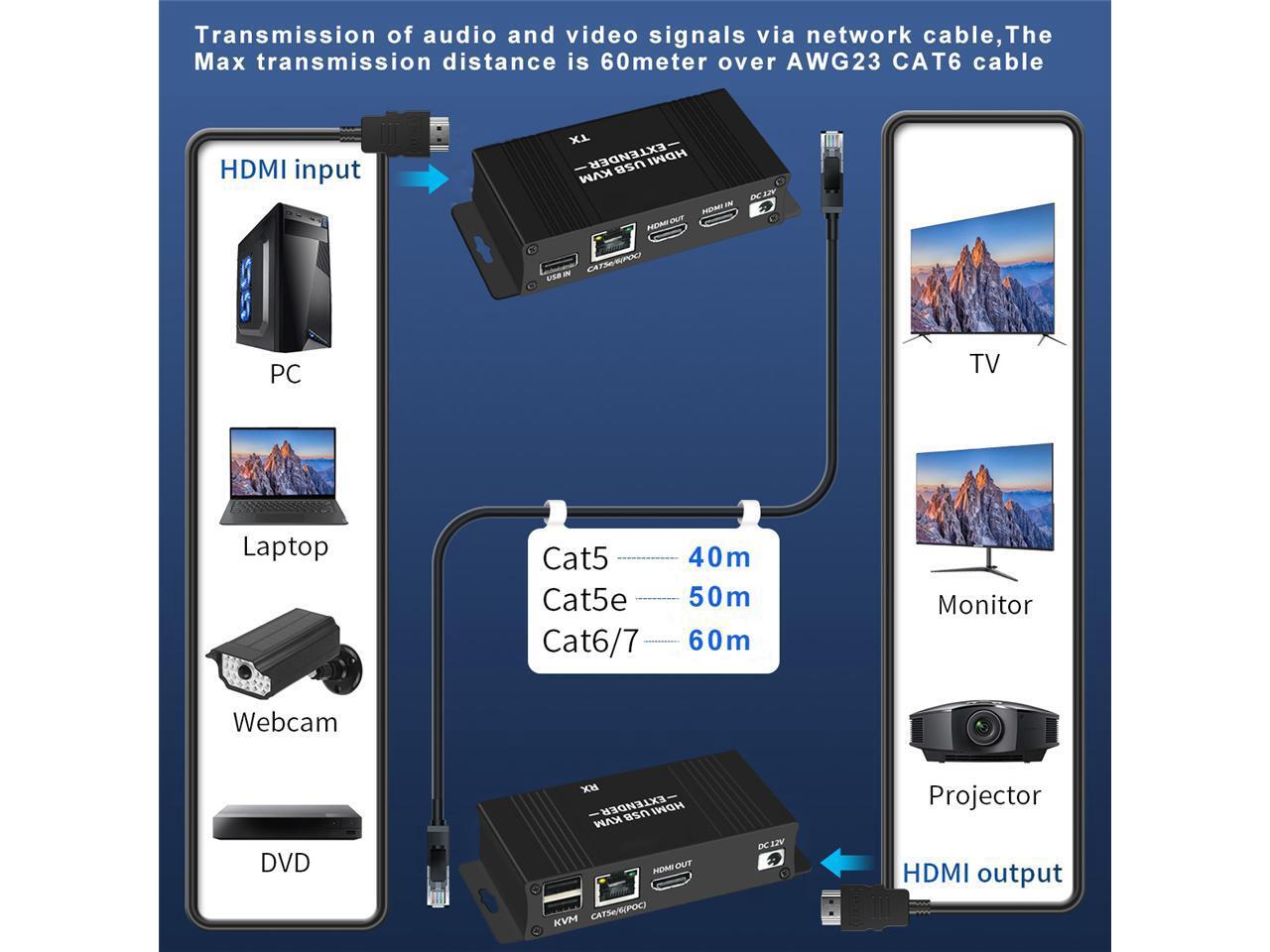 - HDMI extender provides extension of HDMI signals long distances over a single CAT5e/6 cable, it supports high resolution up to 1920x1080@60Hz, POC,HDMI loop out and KVM Remote control. The extender can use for a wide range of applications requiring long distance transmission of high resolution with high quality by its good stability and powerful security.