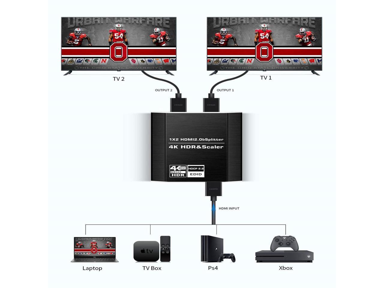 - Using the latest HDMI splitter chip, this 4k HDMI splitter 1 in 2 out is compatible with most devices with standard HDMI interface, inlcuding: Apple TV, XBox, PS3, PS4, PS4 Pro, Fire TV Stick, Blu-Ray DVD player etc