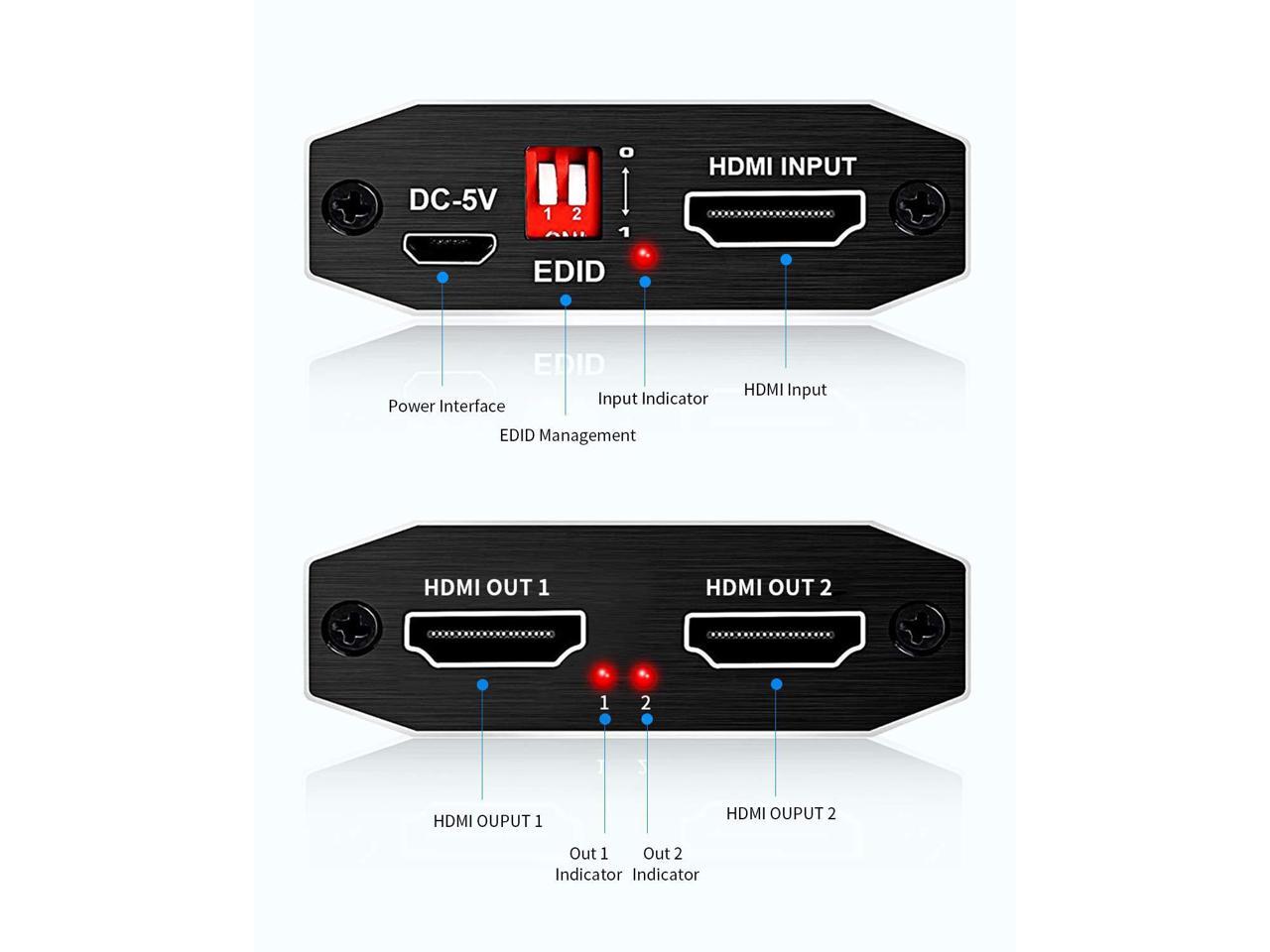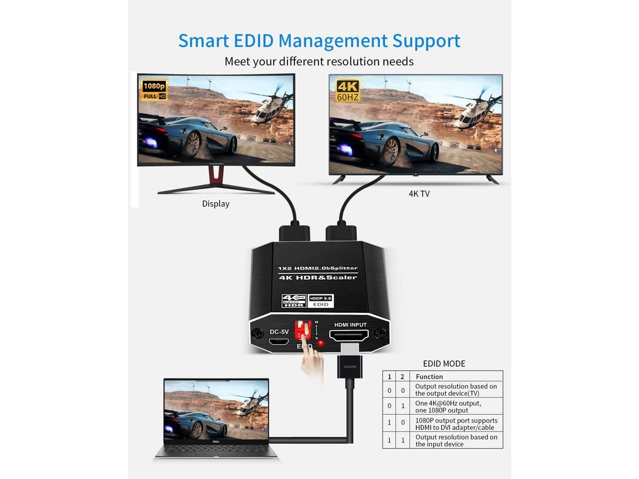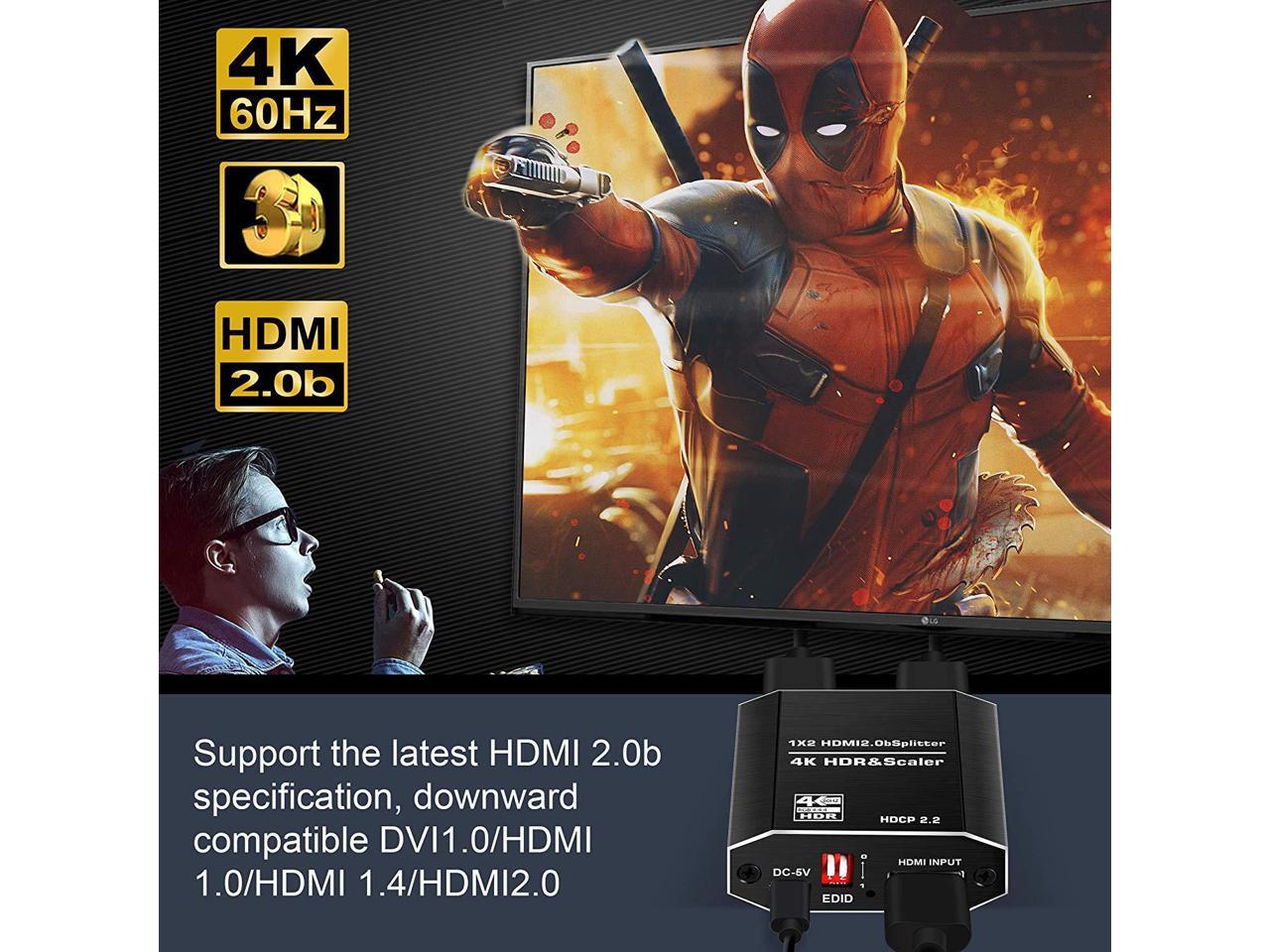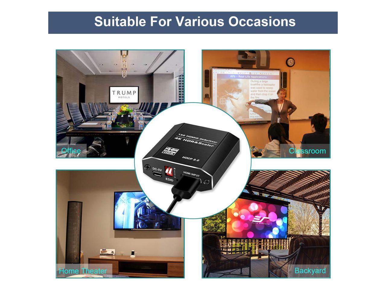 - 4K HDMI splitter supports different resolutions display up to 4k, including 3D, Full HD 1080P, 4K@60hz, 4k HDR & Scaler. Support EDID mode.