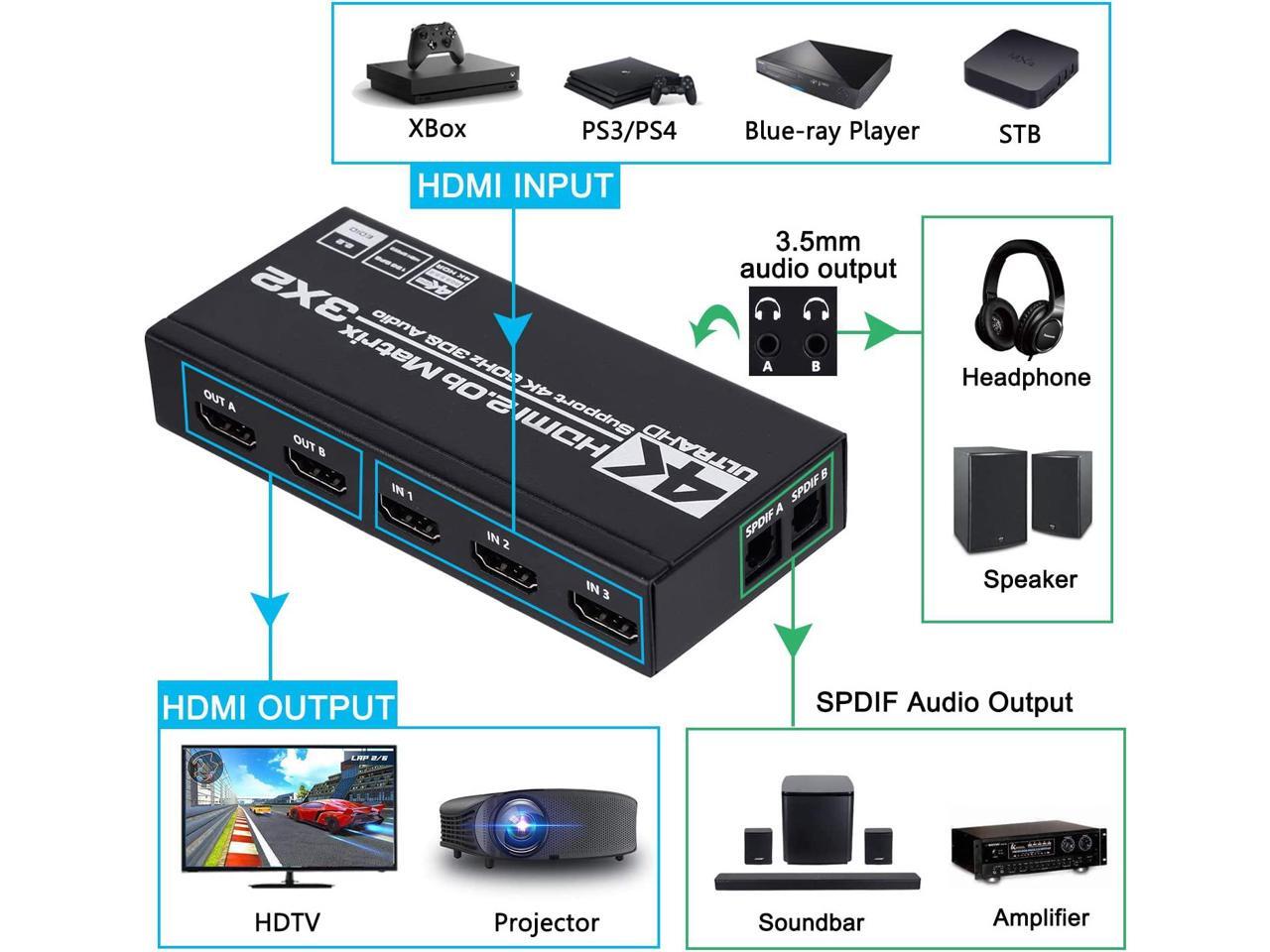 - This HDMI 3x2 Matrix Switch can connect three 4K HDR signal sources to 2 HD display or monitor,and it can also extract the HDMI input Audio signal with Toslink SPDIF optical fiber or 3.5mm stereo headphone output. This 3x2 HDMI Matrix can control by IR remote control and Local Button. It allows 3 HDMI Output devices to be switch or split easily to two HDMI compatible monitors or projectors.