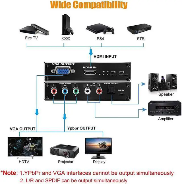 1.HDMI to Component or VGA Converter: it convert HDMI input to analog YPbPr video and R/L audio signal output or VGA video and Toslink SPDIF Audio. Note: YPbPr and VGA interfaces can not output simultaneously.You can select the output source by VGA/YPbPr Switch.This HDMI(input) to YPbPr (output) 1080p scaler converter can freely switch effectively for your output devices.