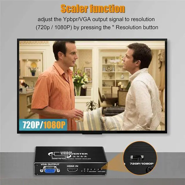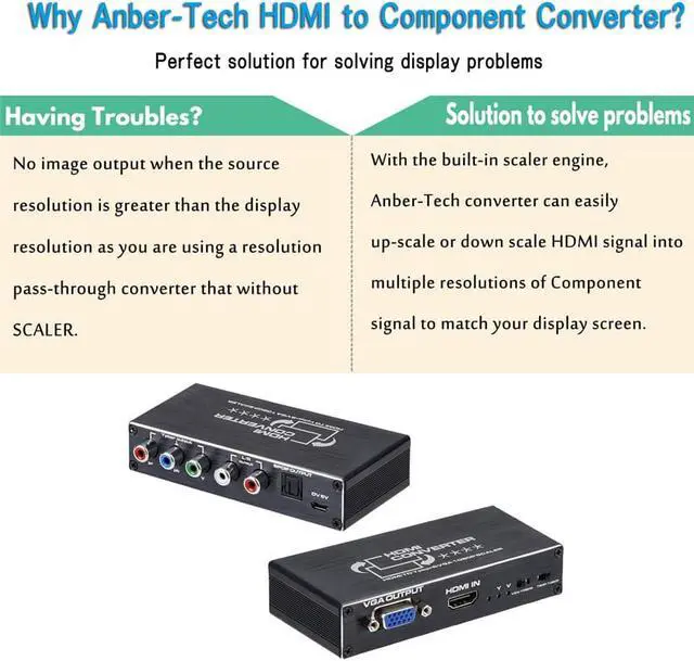 2.With Scaler Function: Support both up-scaling and down-scaling HDMI signal to YPbPr. It can solve display problems when the source resolution is greater than the display resolution.Support OSD (On-Screen Display) for input and output resolutions.