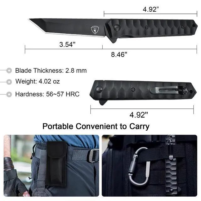 The knife is a 440 steel Tanto blade EDC knife with a 3.54'' blade length, hardness up to 56~57 HRC, and corrosion resistance.