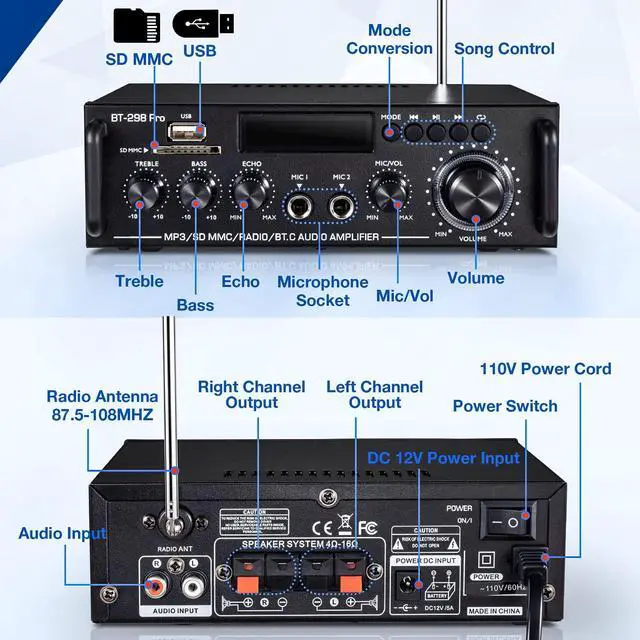 - Compatiable Inputs with Bluetooth connection, RCA & MIC Input, USB Port, SD/TF Card & FM Radio