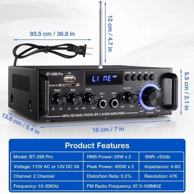 Suacopzar BT-298 Pro Bluetooth Audio Amplifier Home Stereo Receiver, Max 400W RMS 50W 2 Channel Audio Amp