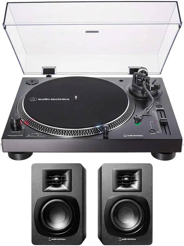 Audio-Technica AT-LP120XUSB-BK Direct-Drive 3-Speed Manual USB Turntable - High-Fidelity Audio - Direct-Drive - DC Servo Motor - Manual Operation - Adjustable Anti-Skate Control - Three Speeds 33-45-78 RPM - Anti-Resonance - Switchable Phono Pre-Amplifier - Two Output Levels - Pitch Control - Die-Cast Aluminum Platter - Signal-To-Noise Ratio >50 dB - USB Function - Electronic Brake - 2.75W Power Consumption - ( 17.80"W x 13.86"D x 5.57"H ) - (Black) with Audio Technica AT-SP3X Bookshelf Speakers - Bluetooth 5.3 - Multipoint Pairing - Plug & Play Turntable Solution - Full Range Audio - 76mm ( 3.0 ) × 2 Speaker Units - 27mm ( 1.1 )
