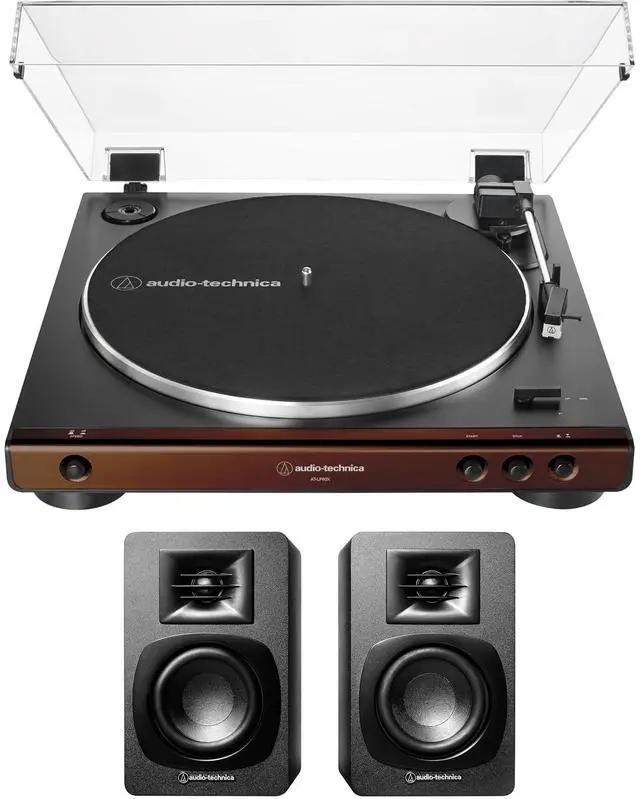 Audio-Technica AT-LP60X-BW Fully Automatic 2-Speed Belt-Drive Turntable - High-Fidelity - Two Speeds 33-1/3-45 RPM - Anti-Resonance - Switchable Phono Pre-Amplifier - Aluminum Turntable Platter - Signal-To-Noise Ratio >50 dB - Two Output Levels - 1.0 W Power Consumption - ( 14.15"W x 14.70"D x 3.84"H ) - (Brown/ Black) with Audio Technica AT-SP3X Bookshelf Speakers - Bluetooth 5.3 - Multipoint Pairing - Plug & Play Turntable Solution - Full Range Audio - 76mm ( 3.0 ) × 2 Speaker Units - 27mm ( 1.1 ) × 2 Tweeter Units - 55 to 20000Hz Frequency Response - RCA Pin Plug × 2 Inputs - 41 Degrees F to 104 Degrees F