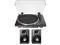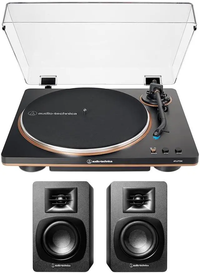 Accessories: Dust Cover, Felt Mat, Platter, Dust Cover Hinges, 45 RPM Adapter, RCA Audio Cable, AC Adapter - (16"W x 13"D x 4.3"H ) - (Black/Bronze) with Audio Technica AT-SP3X Bookshelf Speakers - Bluetooth 5.3 - Multipoint Pairing - Plug & Play Turntable Solution - Full Range Audio - 76mm ( 3.0 ) × 2 Speaker Units - 27mm ( 1.1 ) × 2 Tweeter Units - 55 to 20000Hz Frequency Response - RCA Pin Plug × 2 Inputs - 41 Degrees F to 104 Degrees F