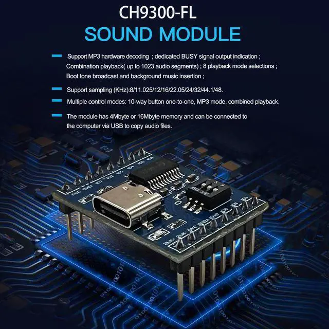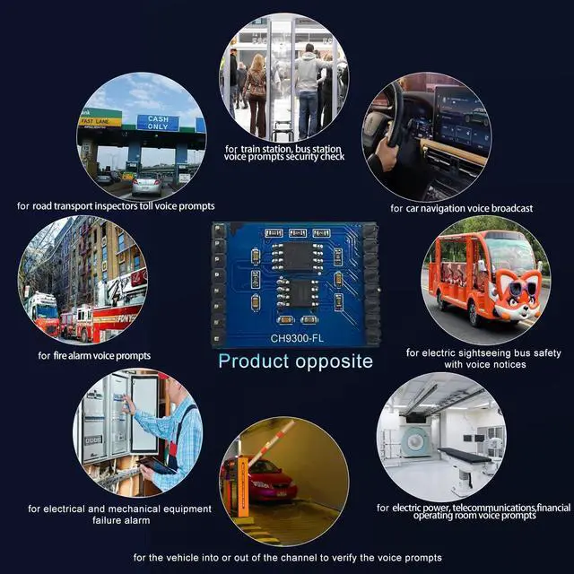 Voice Module : CH9300-FL is a Intelligent sound module, A specialized application for voice broadcasting products. Integrated IO Segmentation Triggering, Standard MP3 and 8 playback mode selections(Please check the manual carefully for details). With 16M memory. Suitable for audio, broadcasting host, digital music player, digital broadcasting host, analog broadcasting host. Good for shopping malls, schools, gymnasiums, office buildings and other public places broadcasting.