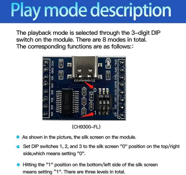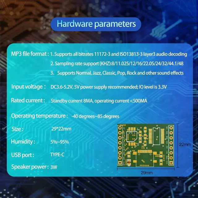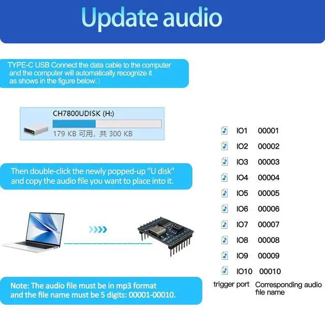 Hardware parameters :MP3 music player sound board has 16Mbyte memory, can be connected to the computer via TYPE-C to copy audio files. Supports all bitrates 11172-3 and ISO13813-3 layer3 audio decoding, Supports Normal, Jazz, Classic, Pop, Rock and other sound effects. About boot sound, Background music, IO port combination playback setting method and application instructions, Please check the manual. Note: The audio file must be in mp3 format, and the file name must be 5 digits: 00001-00010.