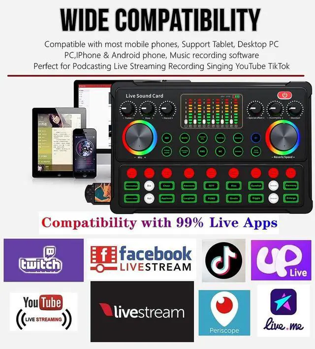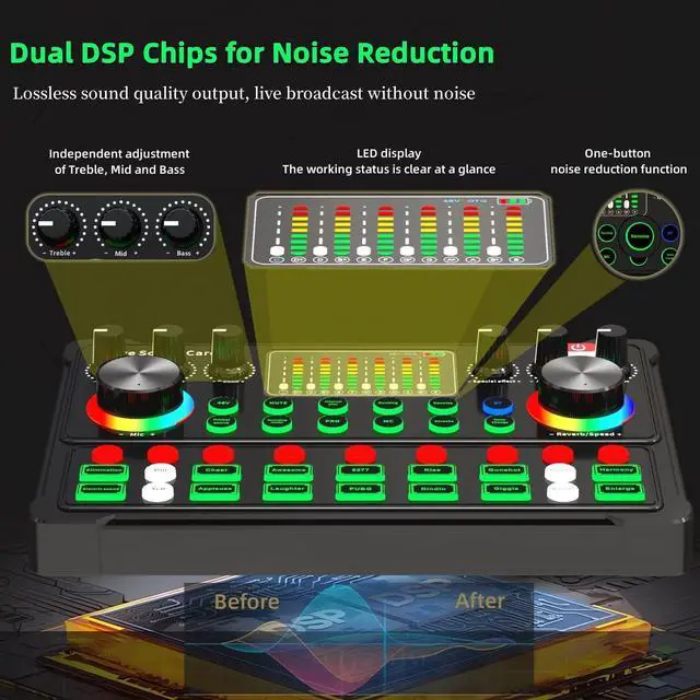 The M300 audio interface mixer has 4 sound variations(Female?Male?Child and Monster)and can produce 23 built-in sound effects and 6 professional modes, support elimination of originalsound, live singing, one-button avoidance, real-time monitoring. Powerful Four-Core DSP chip, with stable signal, nice sound quality and without delay. One-button noise reduction and 50% increase in noise reduction, Built-in 1800MAH high capacity rechargeable battery for 8-12 hours of continuous use. It contains almost all of the commonly used functions, which is designed for recording, podcasting, live streaming, ect.
