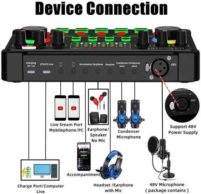 The excellent performance of 48V microphone brings crystal clearer and fuller sound. The microphone itself uses a 24MM large diaphragm microphone core and a dynamic audio chip for fine, noise-free sound quality. High sensitivity and signal-to-noise ratio captures every word clearly.
