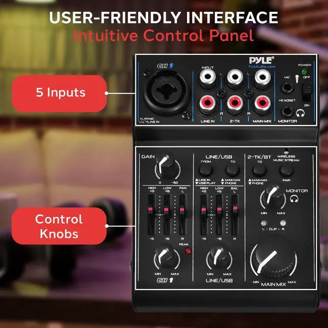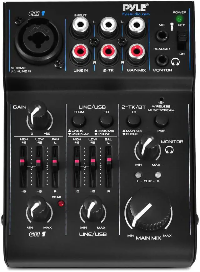 • LED INDICATOR LIGHTS: The recording mixer has LED indicator lights and audio signal clips for user convenience. It has input selection, knobs, master volume controls, independent channel balance and high, plus, low frequency adjustment