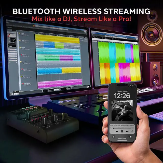 • BLUETOOTH FOR WIRELESS STREAMING: This portable 3 channel DJ sound controller has V3.0 Bluetooth for wireless streaming ability. It works with iPhone, Android, iPad, Tablet, MP3 Player and other devices. The wireless range is 50 ft