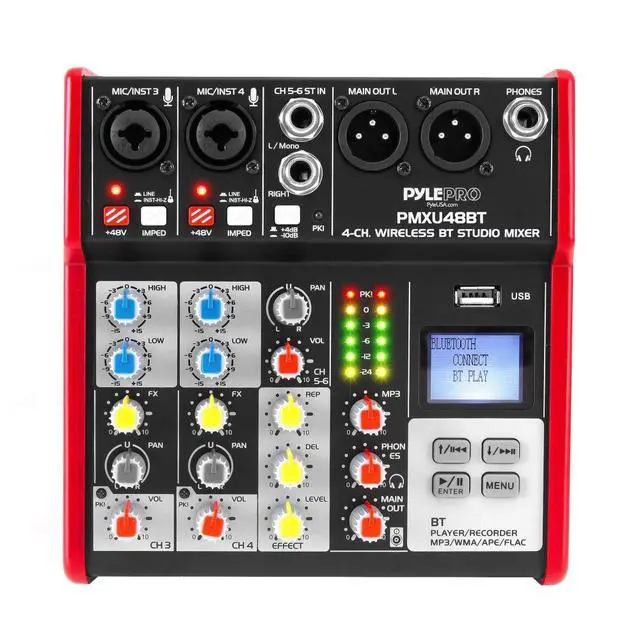 Studio Audio Sound Mixer Board - 4 Channel Bluetooth Compatible Professional Portable Digital DJ Mixing Console with USB Mixer Audio Interface - Mixing Boards For Studio Recording - PMXU48BT