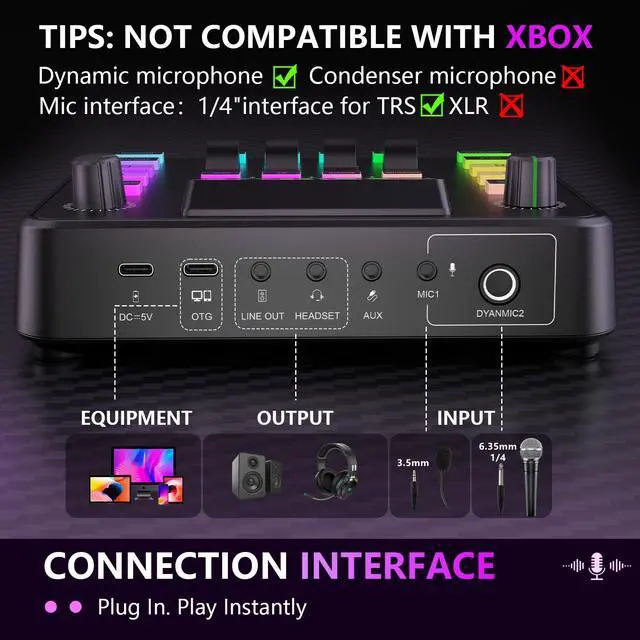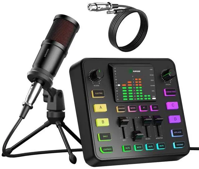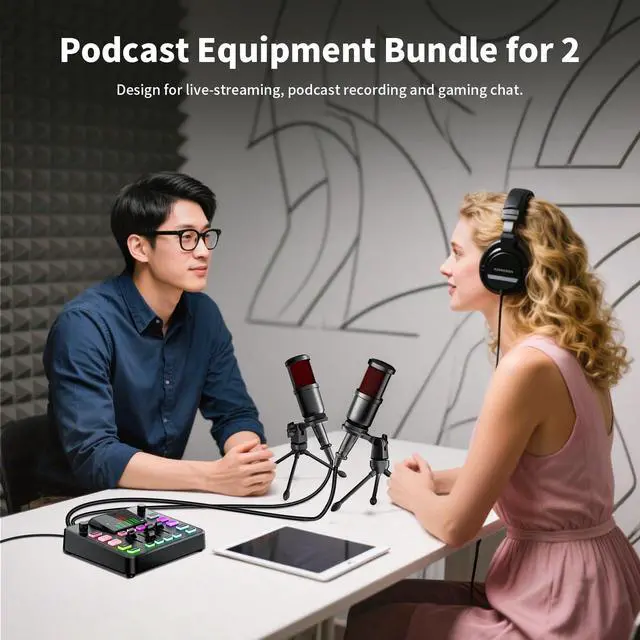 Podcast Equipment BundleElevate your studio with our all-in-one podcast equipment bundle, featuring a professional audio mixer and 1/4(6.35mm) dynamic microphone. Engineered with a high-fidelity preamp.The gaming equipment unlocks crystal-clear vocal capture for broadcast-ready audio. With an excellent signal-to-noise ratio of 70, equipped with sound card noise reduction and a vocal dynamic microphone, it can effectively block out most background noise