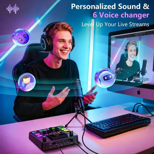 Interesting live streaming equipment4 customizable sound padseach supporting up to 25 seconds of recording. Mimic hilarious sounds and playful voices to tease and entertain your audience. Plus, with 6 voice changers and 2 preset sound effects, you can instantly elevate the energy of your stream and keep viewers engaged.