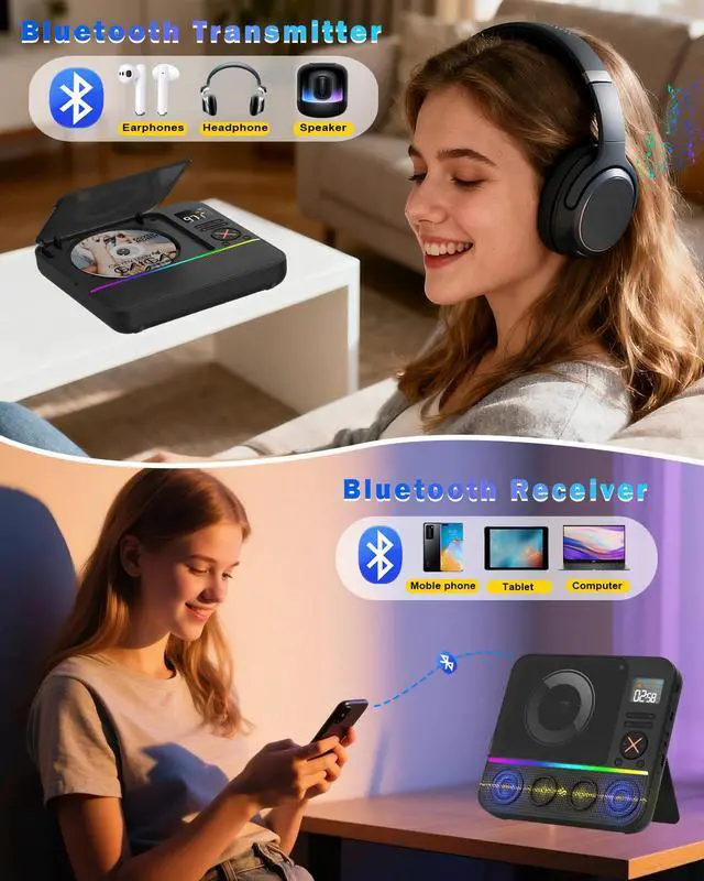 Portable CD player bluetooth support USB disk playback, just copy into USB and enjoy your music and standard 3.5mm input port, connect this CD player to moble phone/speaker or your car.