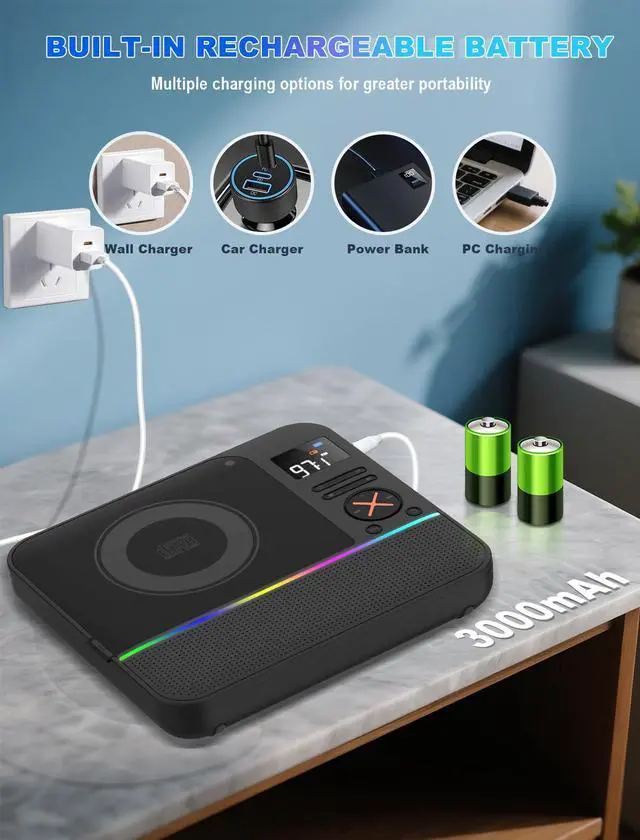 Portable desktop CD player with A-B repeat playback function, a child-friendly learning companion. (A-B Repeat function only works on CD and USB mode)
