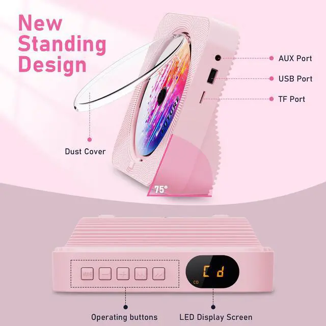 - Dual speakers, HIFI sound: Equipped with Bluetooth 5.1, stable connection, long distance transmission and lower power consumption, this Portable CD Player can not only connect to your wireless headphones or Bluetooth speakers to listen to music from CD/US/TF card, but also receive Bluetooth signal from your cell phone, tablet, laptop and other Bluetooth devices as speakers to play wireless music.