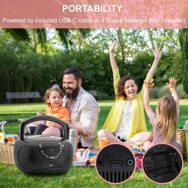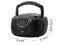 Convenient foldable carrying handle, this portable CD player boombox includes a top-loading CD tray (CD-R/CD-RW compatible), LCD Display, FM Radio, 3.5mm aux-in & headphone jack. The boombox can be powered on by an AC cord or 4x C cell batteries.