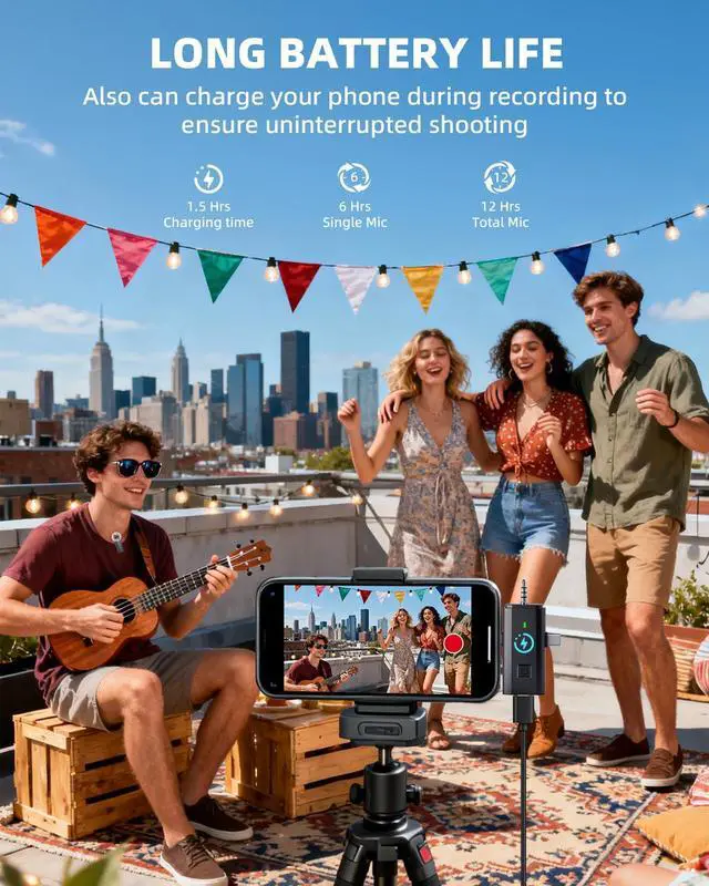 The transmitter (microphone) offers up to 6 hours of battery life, while the receiver provides about 6 hourssufficient for extended creative sessions. A full recharge takes only about 6 hours, and it supports passthrough charging with a power bank for uninterrupted use.