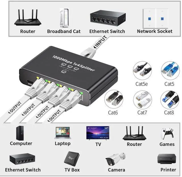 - Our professional Gigabit ethernet splitter 1 to 4 can split a single Ethernet connection to 4 devices simultaneously;