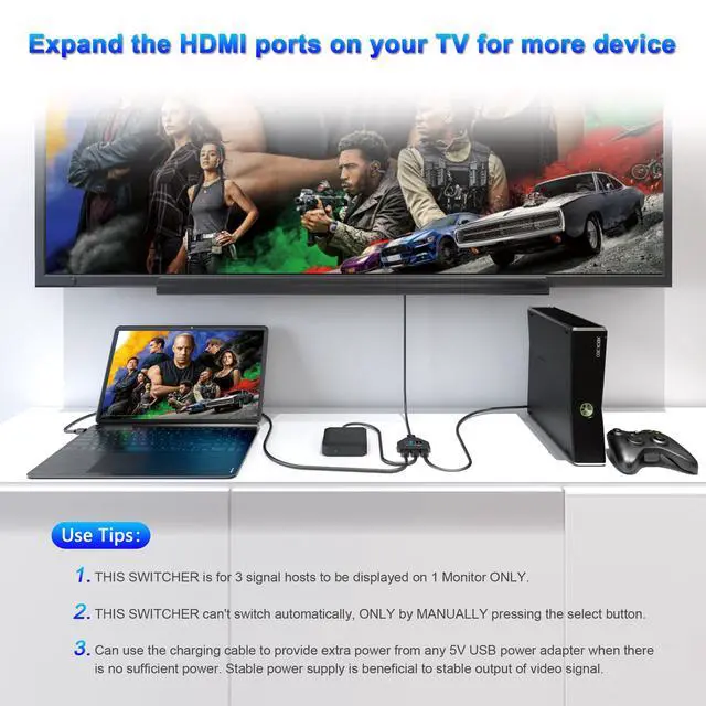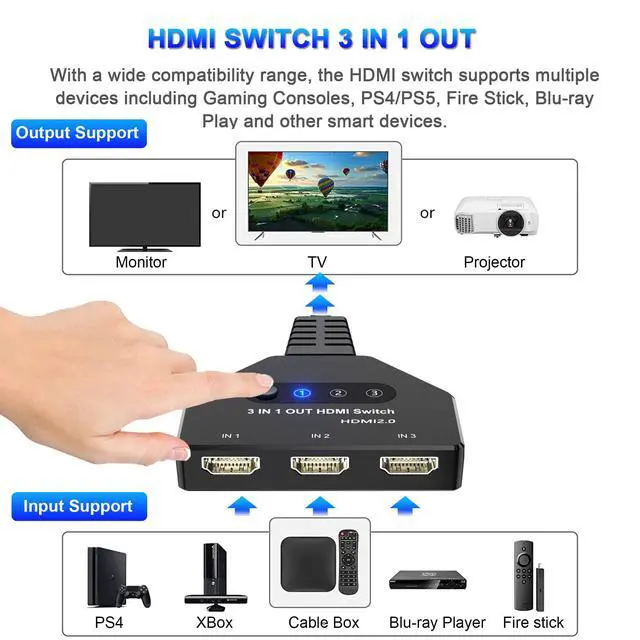 You can easily switch from 3 HDMI sources (e.g. PS5, PS4, TV Box, Xbox One) to 1 HDMI display (e.g. Monitor or TV), avoiding frequent plugging and unplugging of HDMI cables.