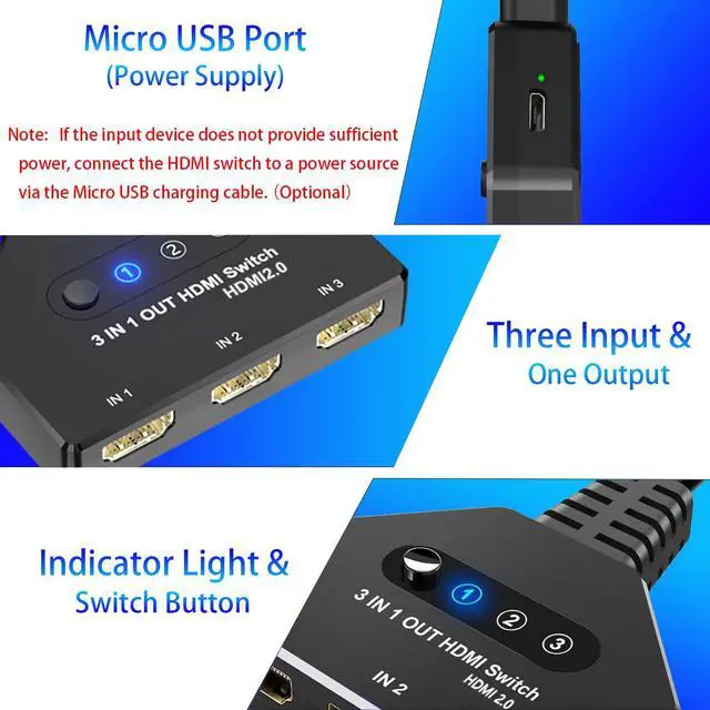 Easy to use it buy just connecting your HDMI devices and pressing the button of HDMI hub to quickly switch to another device, where the LED indicators which port is active.