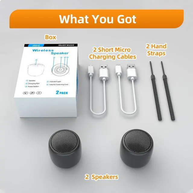 Long press one speaker power button to turn it on, Search Bluetooth pairing name ‘MT’ on device & click to connect. Afer first speaker connected, Power on another speaker and double click its power button, 2 speakers will be connected.