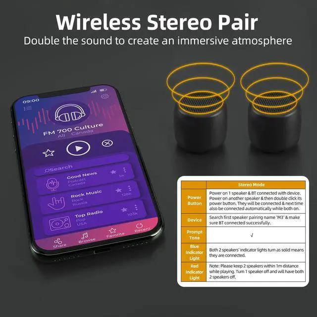 Pair 2 speaker together to play the same music in perfect sync, doubling the volume and creating an immersive 360° stereo sound experience.