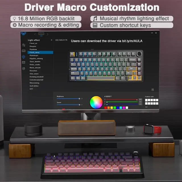 2. 16.8 million cool RGB backlight, 16 kinds of lighting modes adjustable, support software custom;