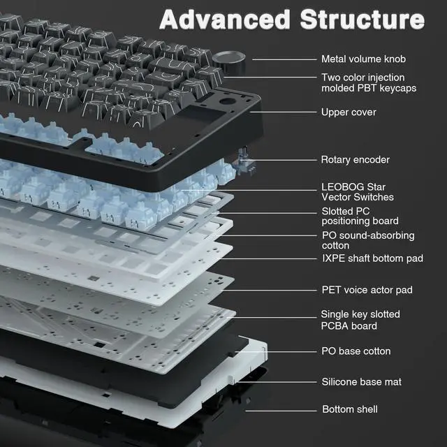 3. Hot swappable pcb keyboard, support 3 pins/5 pins switches;