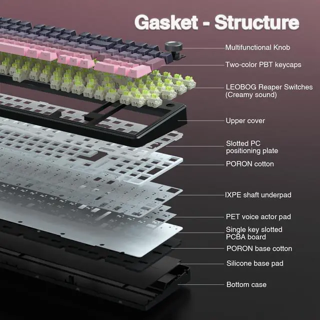 3. Hot swappable pcb keyboard, support 3 pins/5 pins switches;