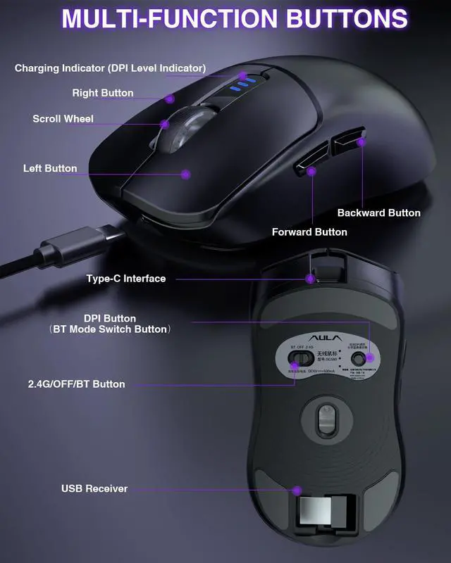 SC580 Wireless Gaming Mouse comes with three connection modes 2.4G/USB-C/BT5.0, 6 levels of adjustable DPI, 6 programmable buttons and three polling rates, perfect for Laptop/PC/Mac/Tablet. This gaming mouse has a built-in 500mAh rechargeable battery that can be charged via USB cable for long time use, perfect for work and gaming entertainment. 82g lightweight design can effectively reduce hand fatigue due to long time work and gaming, greatly improving efficiency.