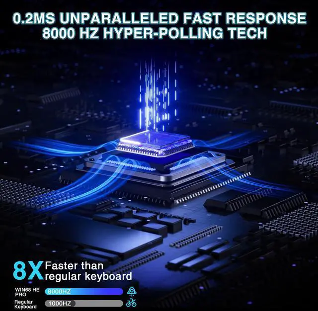 WIN68 HE PRO Fast trigger gaming keyboard is equipped with advanced hall effect magnetic switches, offering polling rates of up to 8000Hz for ultra-fast response times and 0.2ms ultra-low latency.