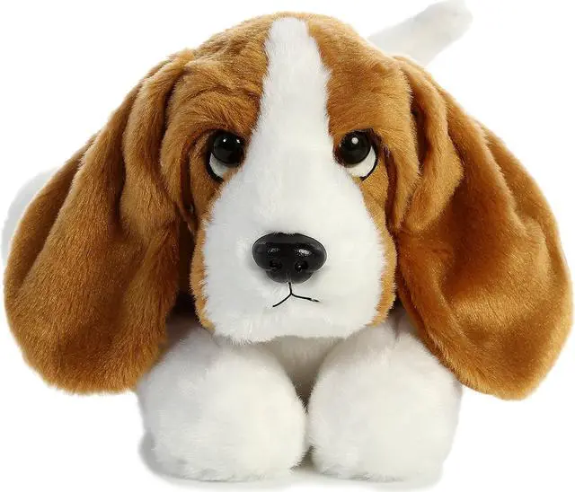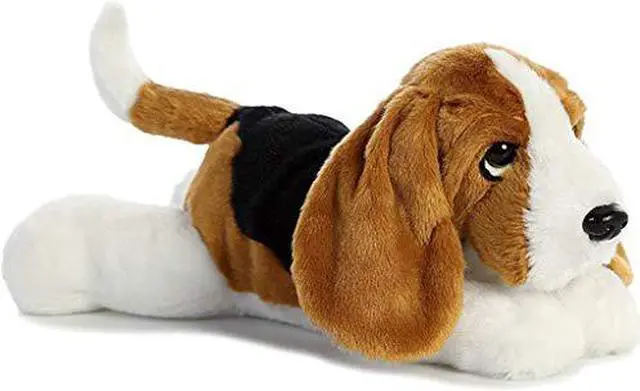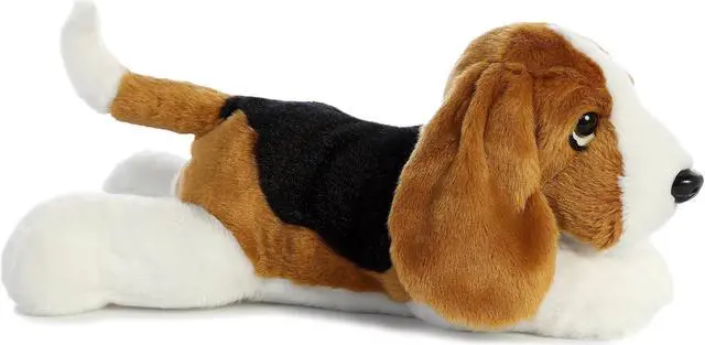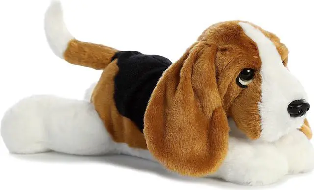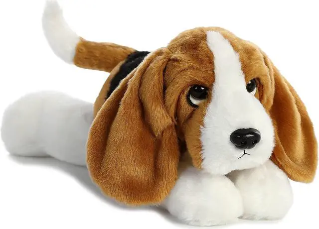 Auroras Flopsie collection styles your favorite animal companions in a resting position for added cuteness and ease when playing, cuddling, and more! This Basset Hound is brown, black, and white with adorably droopy ears and facial expression. Bringing home this sweet Basset Hound plush will have you fall in love with this puppy.