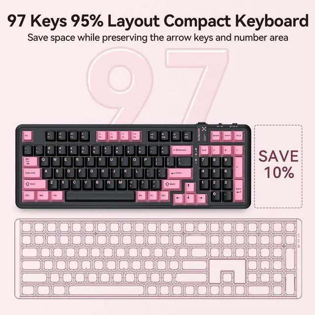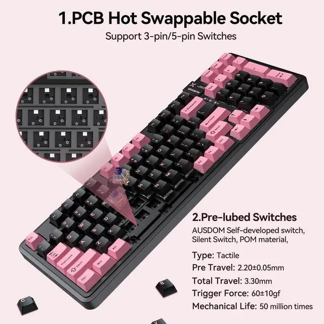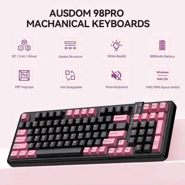 AUSDOM 98Pro Silent Wireless Mechanical Keyboard,Tri-Mode Bluetooth/2.4GHz/Type-C Hot Swappable Custom Keyboard with Backlit,Gasket Structure,Pre-lubed Tactile Switches(Black & Pink-slient)