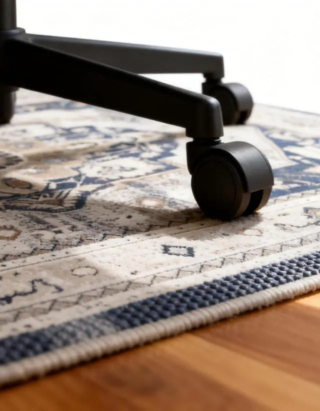 - Unlike hard plastic mats, this mat features a soft low-pile faux cashmere surface combined with a slip-resistant backing — delivering quiet, controlled gliding without damaging your floors.