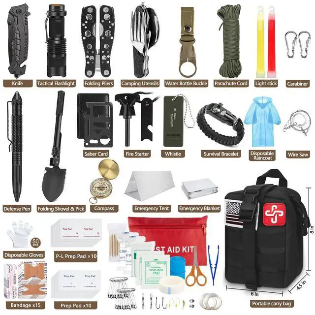 Taimasi comprehensive survival kits not only includes 22pcs multipurpose survival tools and a emergency tent and blanket, but it also offers 45pcs first aid kit & 100 cotton swabs, 50pcs disposable gloves and a fishing tools set which can meet your different needs.
