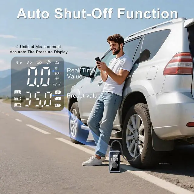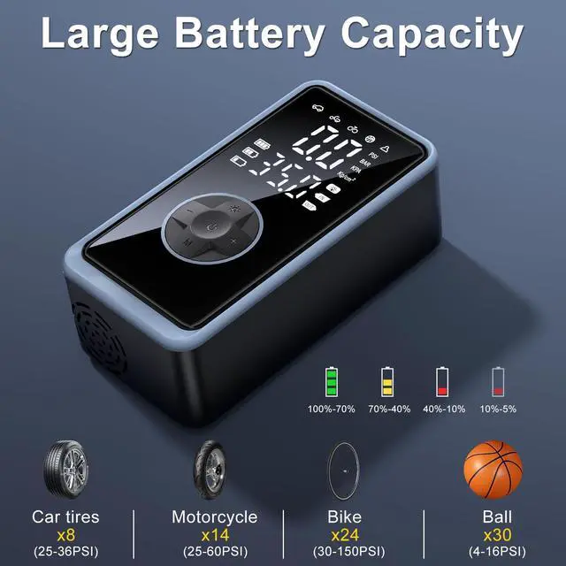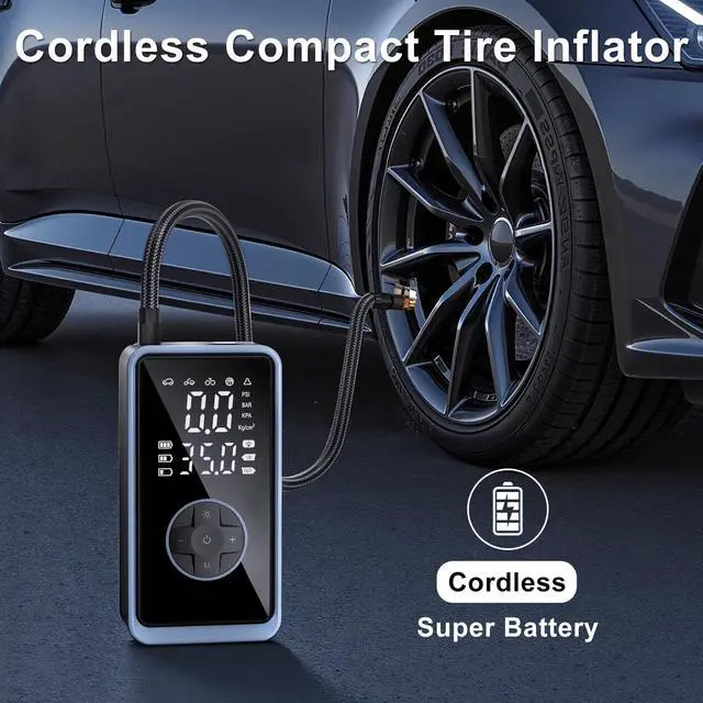 Meikakka Electric Tire Inflator is powerful, featuring an internal battery and 12V DC power support that lets you inflate tires quickly and easily wherever you are. Whether you need to pump up your car tire, bicycle tires, or other inflatables, this device handles it all. This versatile portable tire pump doubles as a bike pump with gauge and a car tire inflator, giving convenience to cyclists and drivers alike. Its portable car air compressor function ensures youre never left with a flat tire. The electric air compressor car feature makes it perfect for on-the-go use, while the tire air pump keeps your tires at optimal pressure. This air compressor portable device is not just for cars; it also works as a compressor tire inflator for bikes and more. As an auto cordless tire inflator with 12V DC compatibility, it delivers up to 150 PSI, making it a strong air compressor. Whether you need a car tire air pump, a portable bicycle pump, or an electric air pump for sports balls, this rechargeable air pump is ideal. Compact and lightweight, its easy to carry, turning it into your go-to portable pump car companion. With a built-in battery and 12V DC power option, this battery powered air pump doubles as a reliable electric pump for emergencies, inflating fast with or without cords. The portable car air pump lets you top off tires anytimewhether using the internal battery for on-the-spot needs or 12V DC for extended usewhile the tire air compressor keeps your trips safe. Perfect as a car tire pump or a bike air pump, it adapts to different inflation needs effortlessly. With our air compressor tire inflator, you get a durable, multi-use tool that works as both a car tire inflator and a portable air compressor for bikes and more. Compact and efficient, the Electric Tire Inflator is the best tire pump car companion, keeping your tires in top shape. Get it and enjoy the convenience of a portable air compressor for car tires, with dual power options to suit any scenario
