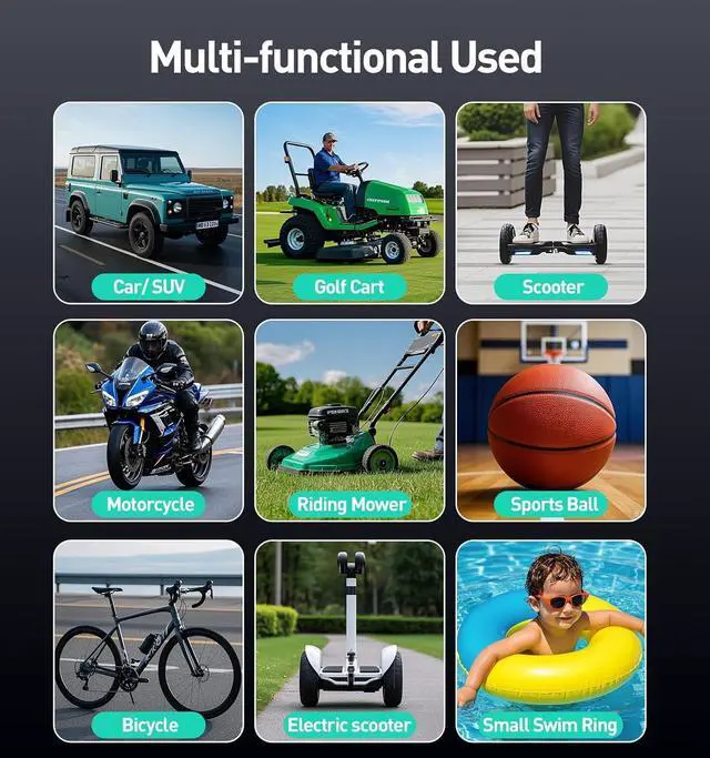 MULTIFUNCTIONAL AIR PUMP: Portable tire inflator cordless has 5 modes forcar tire,bike tire, motorcycle tire, ball and inflatable products,switch by oneclick,it is a must-have traveling car accessories for the elderly and men. Easyto operate and save time, bringing you the convenience of traveling by car